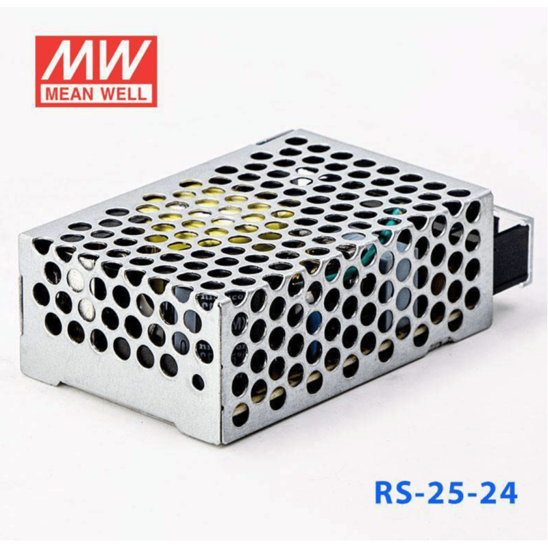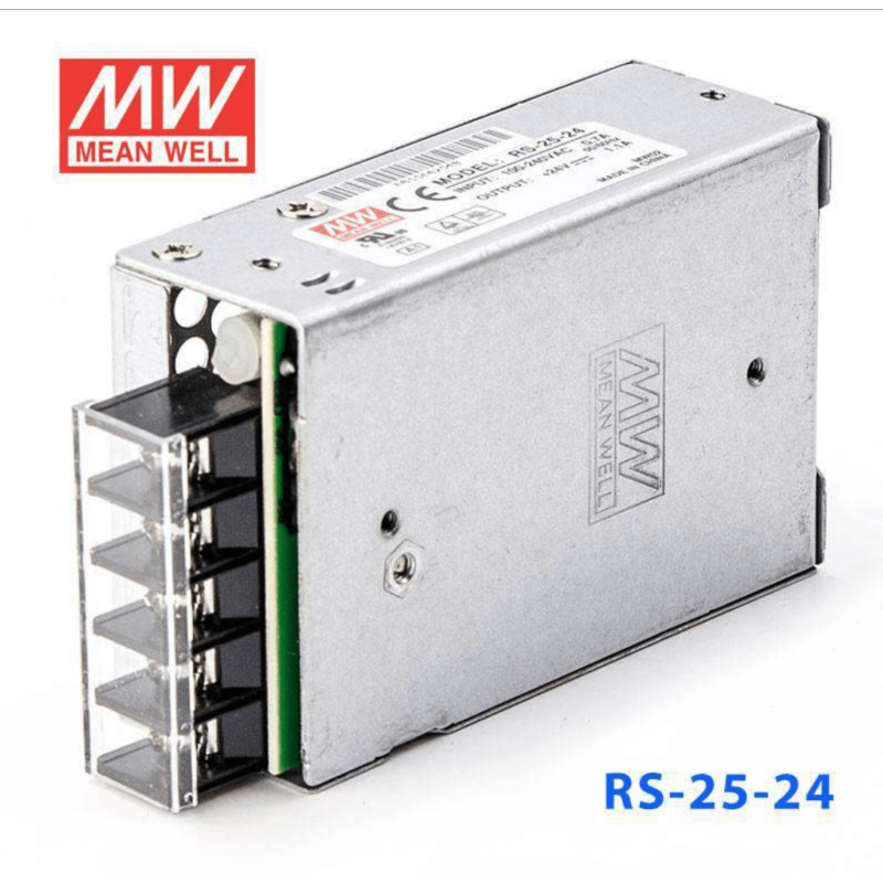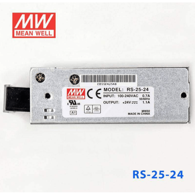 The Meanwell RS-25-24 is a 25W AC-DC enclosed power supply, designed for DIN rail mounting and industrial applications. Providing 24V DC at 1.1A, it is perfect for powering IT, AV, and industrial equipment with a compact design and free air convection cooling.