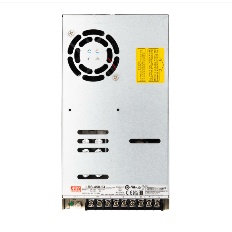 The Mean Well LRS-450-24 is a robust switching power supply (SMPS) designed to deliver a stable output voltage of 24V with a maximum current of 18.75A, resulting in a power output of 52.8W. With its compact and efficient design, it is suitable for a wide range of applications, including LED lighting, industrial automation, and electronic devices. Built with high-quality components, it ensures reliable performance and longevity. Additionally, it features protections against over-voltage, over-current, and short-circuit to safeguard connected equipment. Overall, the Mean Well LRS-450-24 offers efficient power delivery in a compact form factor, making it an ideal choice for various industrial and commercial applications.